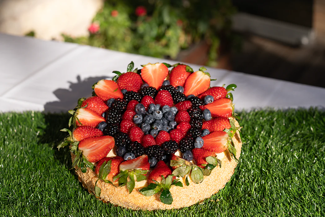 A delicious mixed fruit cheesecake made in-house at Mozart's On The Lake.Â